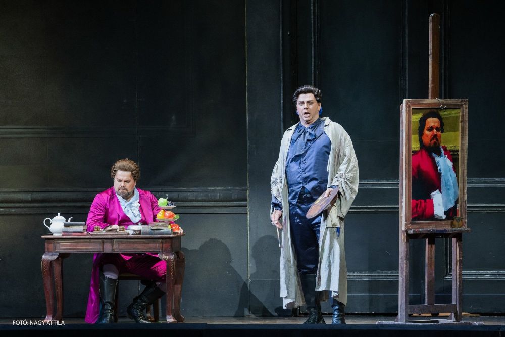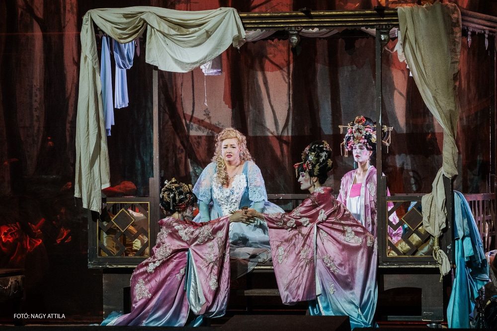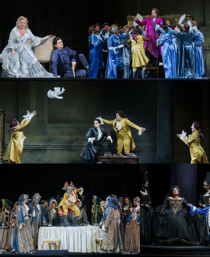 Természetesen vannak olyan rendezések, amelyek bár nem követik az Arisztotelész által meghatározott hely-idő-cselekvés hármasát, mégis fogyaszthatók a nézők számára (nem sok ilyennel találkozik az érdeklődő). Talán ezért is volt a szemnek kellemes Verdi Álarcosbáljának sorozata, Fabio Cereza 2018-as rendezésében. Fantasztikus, színes, aprólékosan kidolgozott kosztümöket láttunk (jelmeztervező: Giuseppe Palella), Ameliáé különösen díszes volt, a kórus mozgatása hatásos látványt nyújtott (mozgástervező: Mattia Agatiello). A fehér és fekete angyalok szerepeltetése igazán jó ötletnek bizonyult. A színpadkép is tetszetős volt (díszlettervező: Tiziano Santi): a puritán berendezés nem vonta el a figyelmet az énekesekről palota fogadótermében játszódó jelenetnél, a bál központi eleme egy asztal volt. A 2. felvonás – (az akasztottak dombja) japán couleur localt kapott: japán hölgyek hosszú körömmel jelentek meg, a háttérben, a tüllfüggöny mögött mintha orgia zajlott volna. Bódítószert szív Amelia és a király, talán bátorításként, talán másért. A helyszínre utaló szerzői jelzéssel szöges ellentétben áll a rendezés, kár volt ráerőszakolni, ráhúzni a japán környezetet. Ceresa Renatót festőként képzelte el, a harmadik felvonásban rengeteg kép szerepelt a színpadon. A zene nagyszerű: Verdi rendkívül jól jellemez ebben a műben (is), a hangulatváltások viszik előre és teszik pergővé a darabot. Talán ez az a Verdi-opera, ahol több fúga, fugato szerepel. Ez Verdi egyetlen operája, ahol a szerző nadrágszerepet iktatott be.