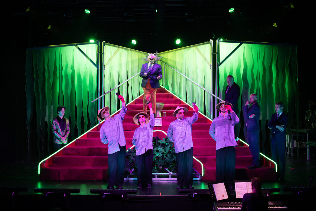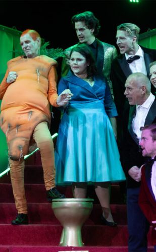 Jóízű nevetést váltottak ki a váratlanul felhangzó vendégszövegek, vendégdallamok. Elég csak az előadásról közzétett fotókon is látható disznó álarcú egyenminiszterekre gondolni, akik a többi embertől elkülönülve, rajtuk uralkodva akarják a pozíciójukat, életmódjukat, kiváltságaikat megőrizni. „Eljött a gyökérség kora” – halljuk, értelmezzük is rögtön a gyökér—bunkó, ostoba metaforát.