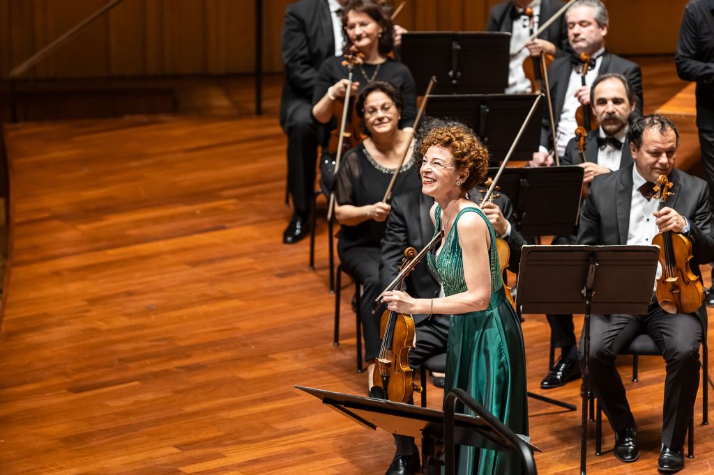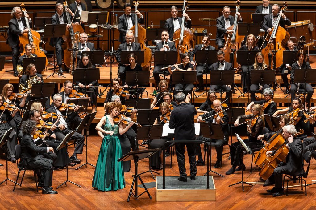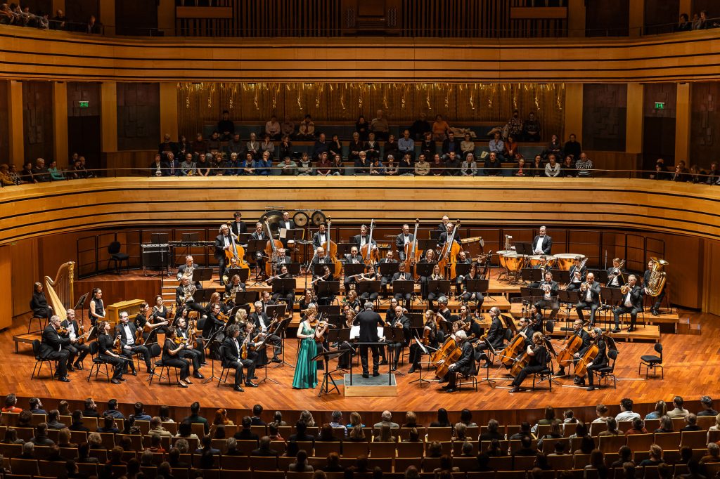 A szimfónia előtt Widmann klarinétra írt Fantáziája hangzott el, a címet igazoló változatos, izgalmas hangzással. Ez alkalommal is élvezetes volt a darab, a kottalapok leesése csak fokozta a hatást. A nyitány után Widmann 2. hegedűversenye töltötte be a termet, de még nem az első tétel, az Una ricercar elején. Hogy miért nem? Mintha egy gyermek ismerkedne a hegedűvel, Carolin Widmann a vonóval körbesimogatta a hegedű testét, a hangszert nem az álla alatt tartotta. Óvatosan ütögette a hangszer testét, próbálgatta a hangokat a vonóval, majd énekelt hangszere dallamához.